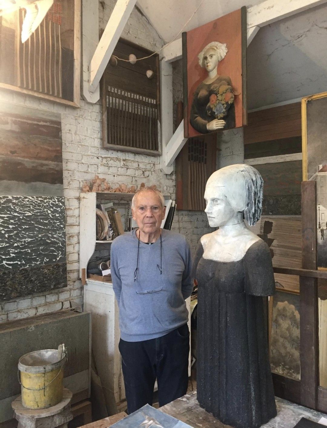 un photo de l'artiste avec la sculpture dans son atelier