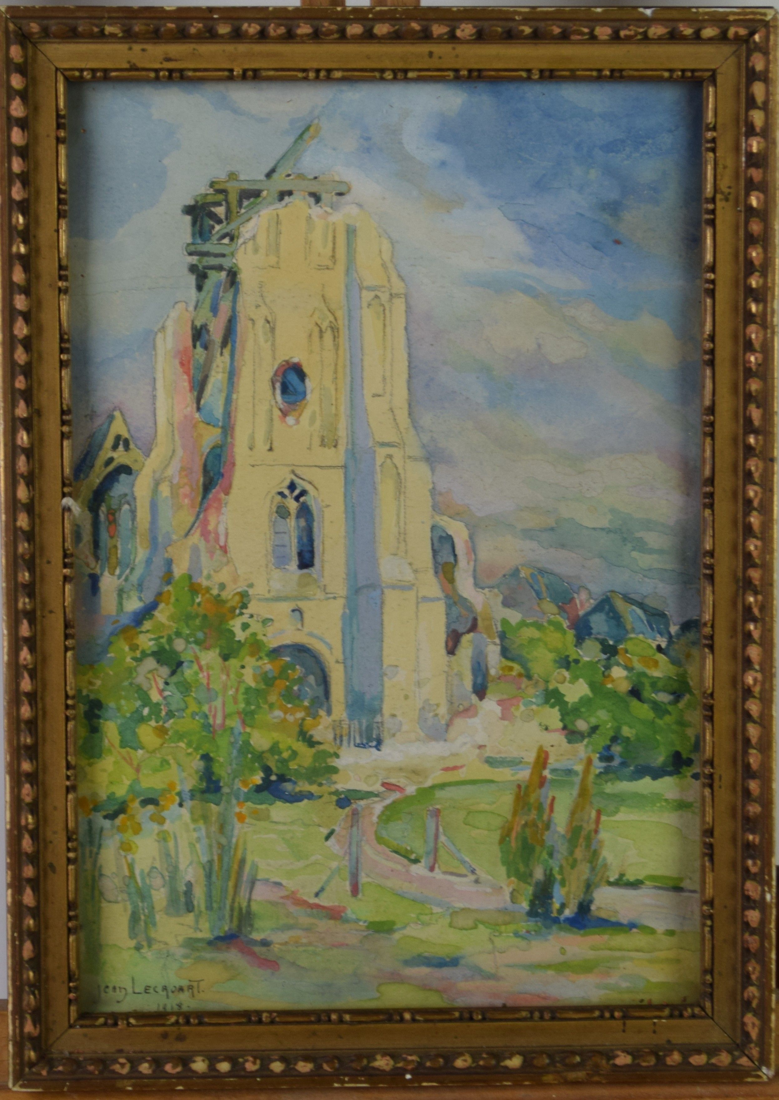 Date : 1918 Type : tableau Technique : aquarelle Support : papier Sujet : village,église Cadre : oui Dimension : 21cm x 14cm (HxL) Signature : oui Contre-signature : non Monogrammé : non Epoque : 1ère moitié 20e siècle Prix de vente : 45 Eur.