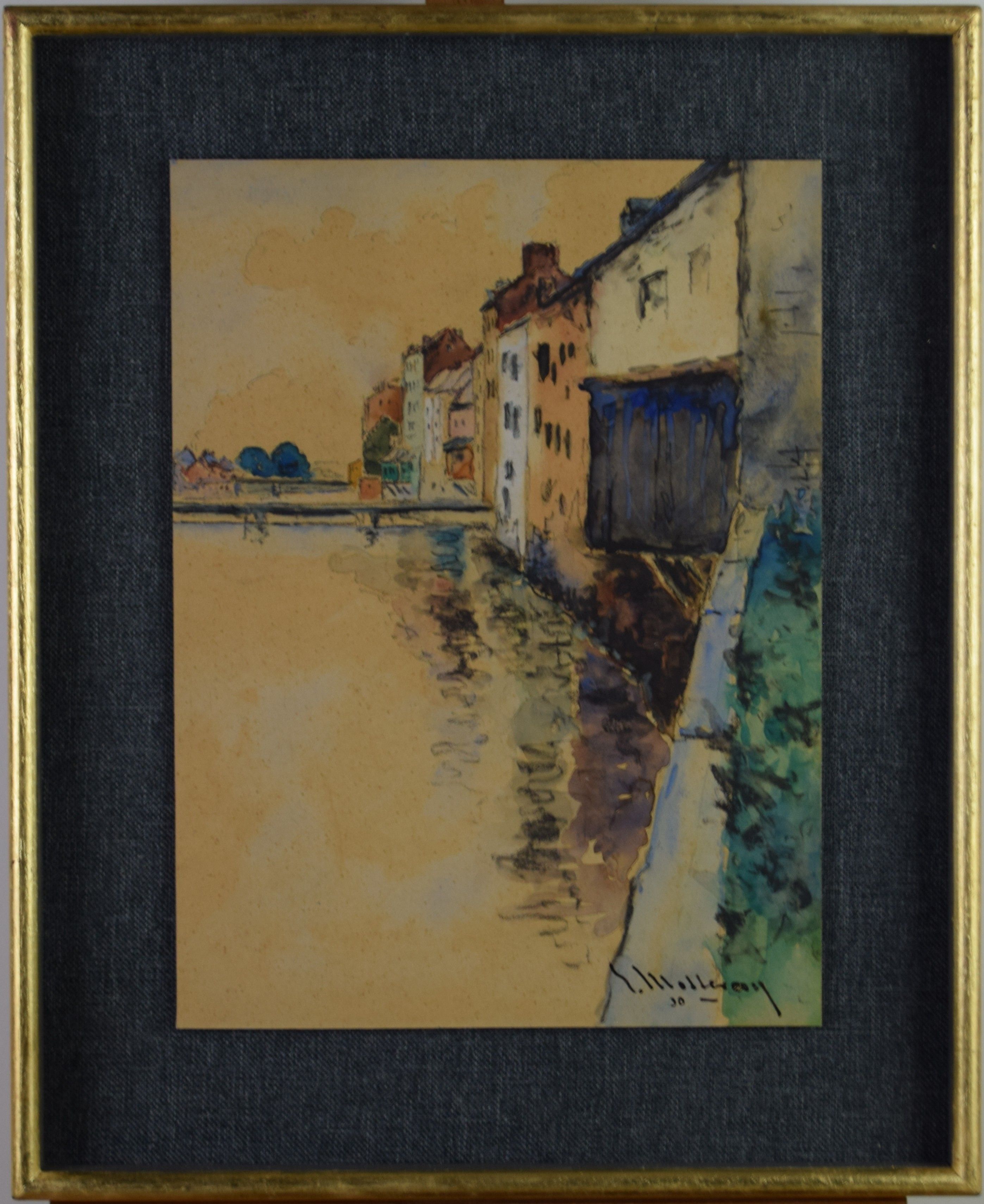 Réf. : JMG Date : 1930 Type : tableau Technique : aquarelle Support : carton Sujet : ville Cadre : oui Dimension : 29cm x 21cm (HxL) Signature : oui Contre-signature : non Monogrammé : non Epoque : 1ère moitié 20e siècle Prix de vente : 90 Eur.