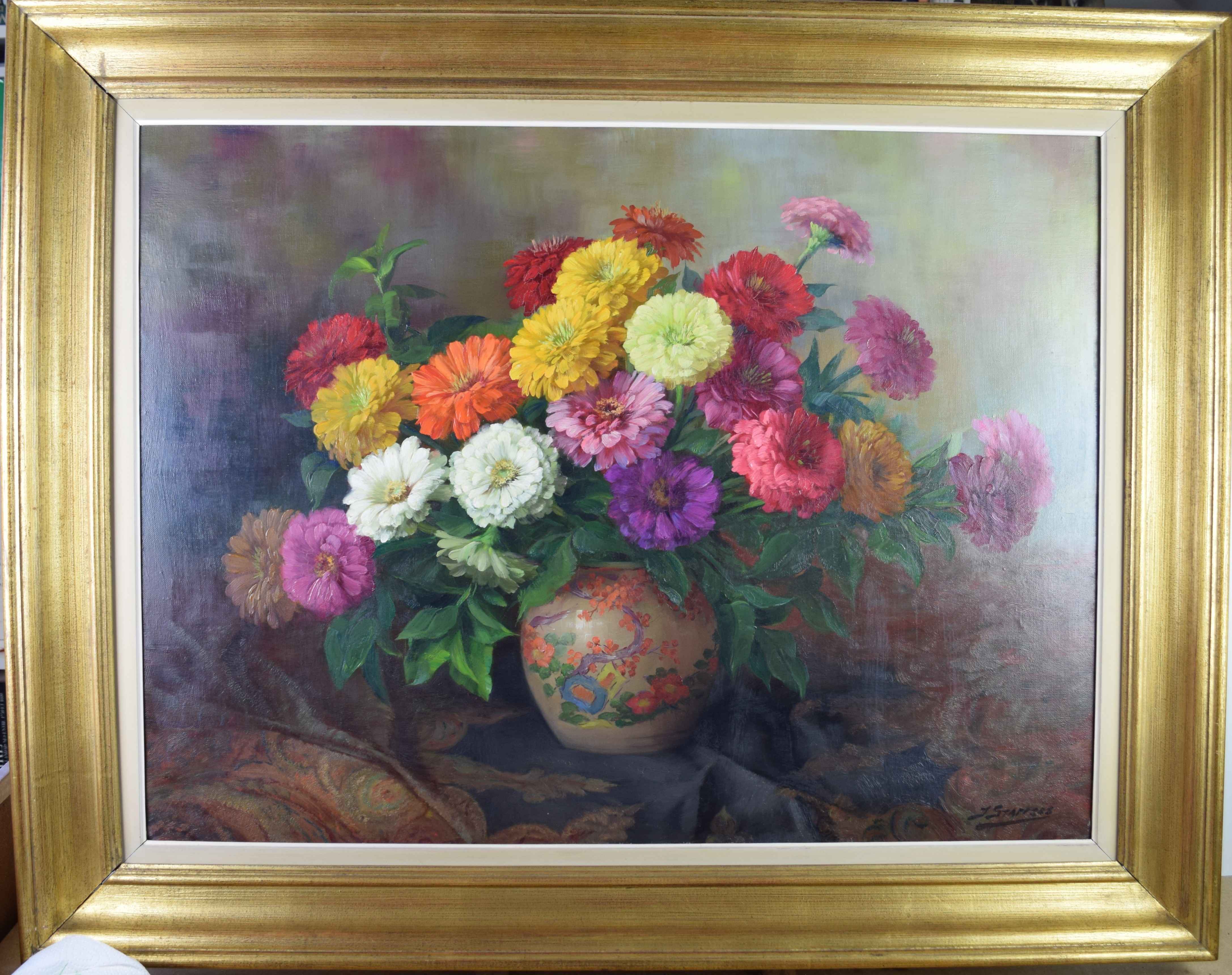 Type : tableau Technique : huile Support : toile Sujet : fleurs,nature morte Cadre : oui Dimension : 64cm x 84cm (HxL) Signature : oui Contre-signature : non Monogrammé : non Epoque : 1ère moitié 20e siècle Prix de vente : 1100 Eur.